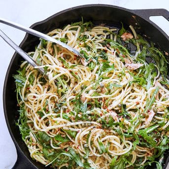 Subimos el fuego a medio, incorporamos 1 taza del líquido reservado, llevamos a hervor suave y cocinamos hasta que la salsa se haya reducido a la mitad, unos 3 minutos. Agregamos la rúcula junto con 2 cucharadas del líquido y mezclamos hasta que se hayan marchitado.
