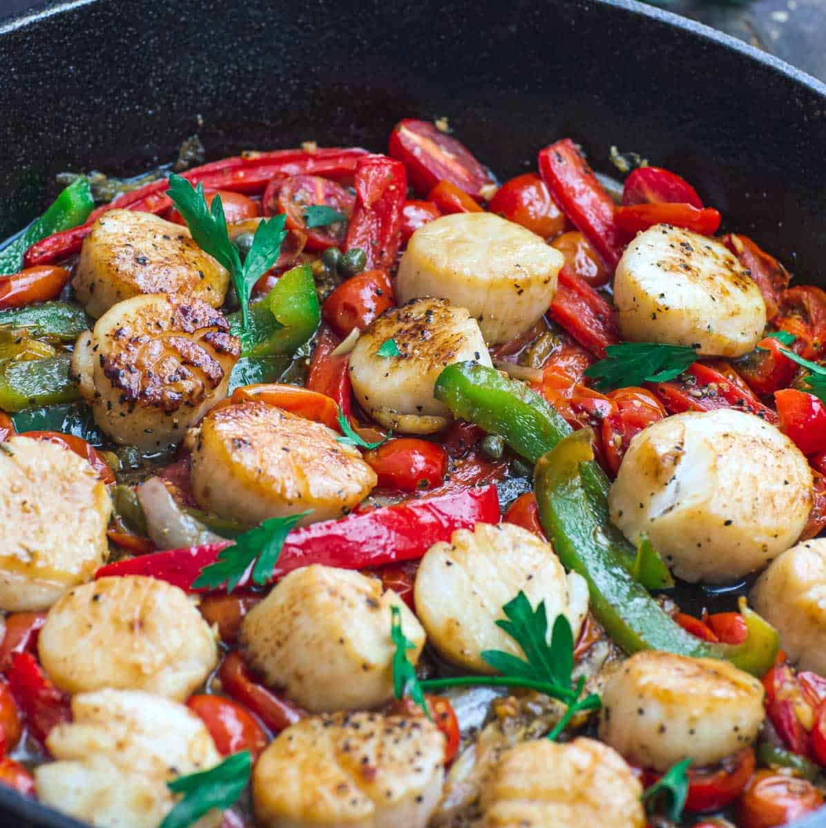 VIEIRAS ESTILO MEDITERRÁNEO, CON TOMATES Y MORRONES