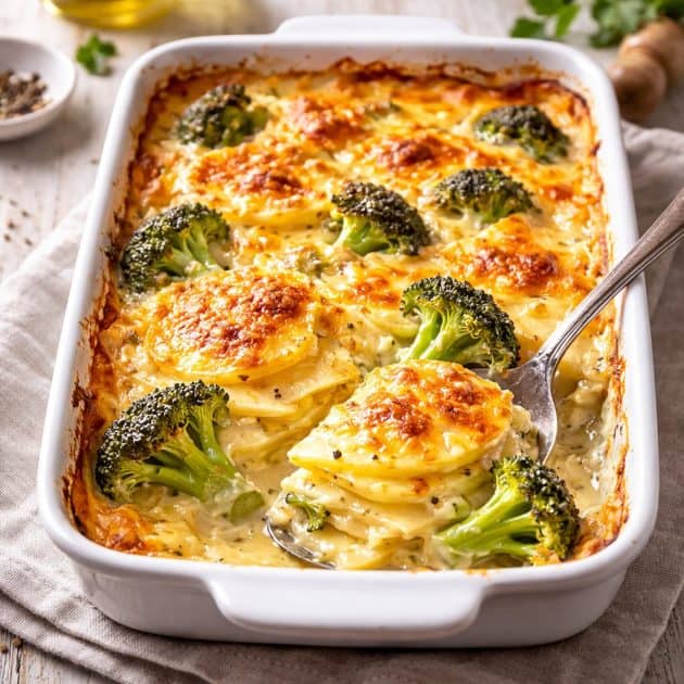 Capas finas de papa que se cocinan lentamente en una salsa blanca suave, intercaladas con brócoli apenas blanqueado y terminadas