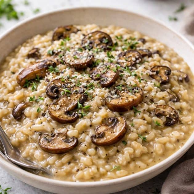 Un risotto sencillo y muy reconfortante, de esos que llenan la cocina de aroma mientras se preparan. Los champiñones aportan
